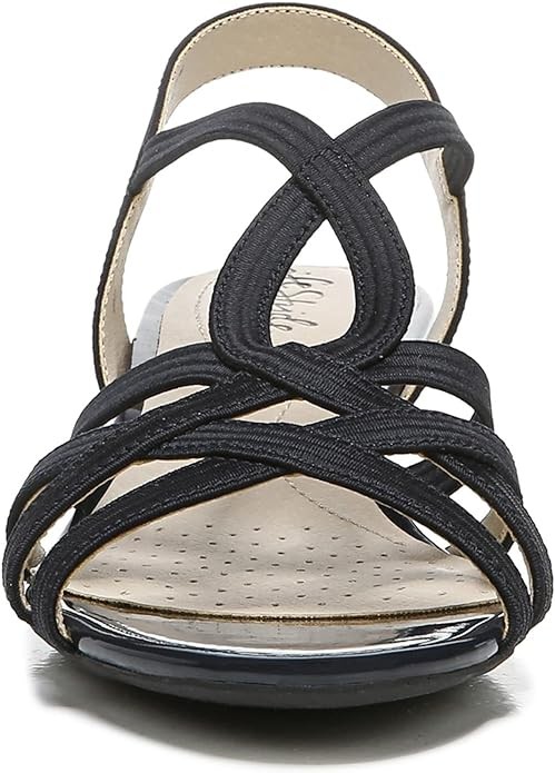 • Fabric upper with an open toe, heel sling strap, and crisscrossing strap detailing