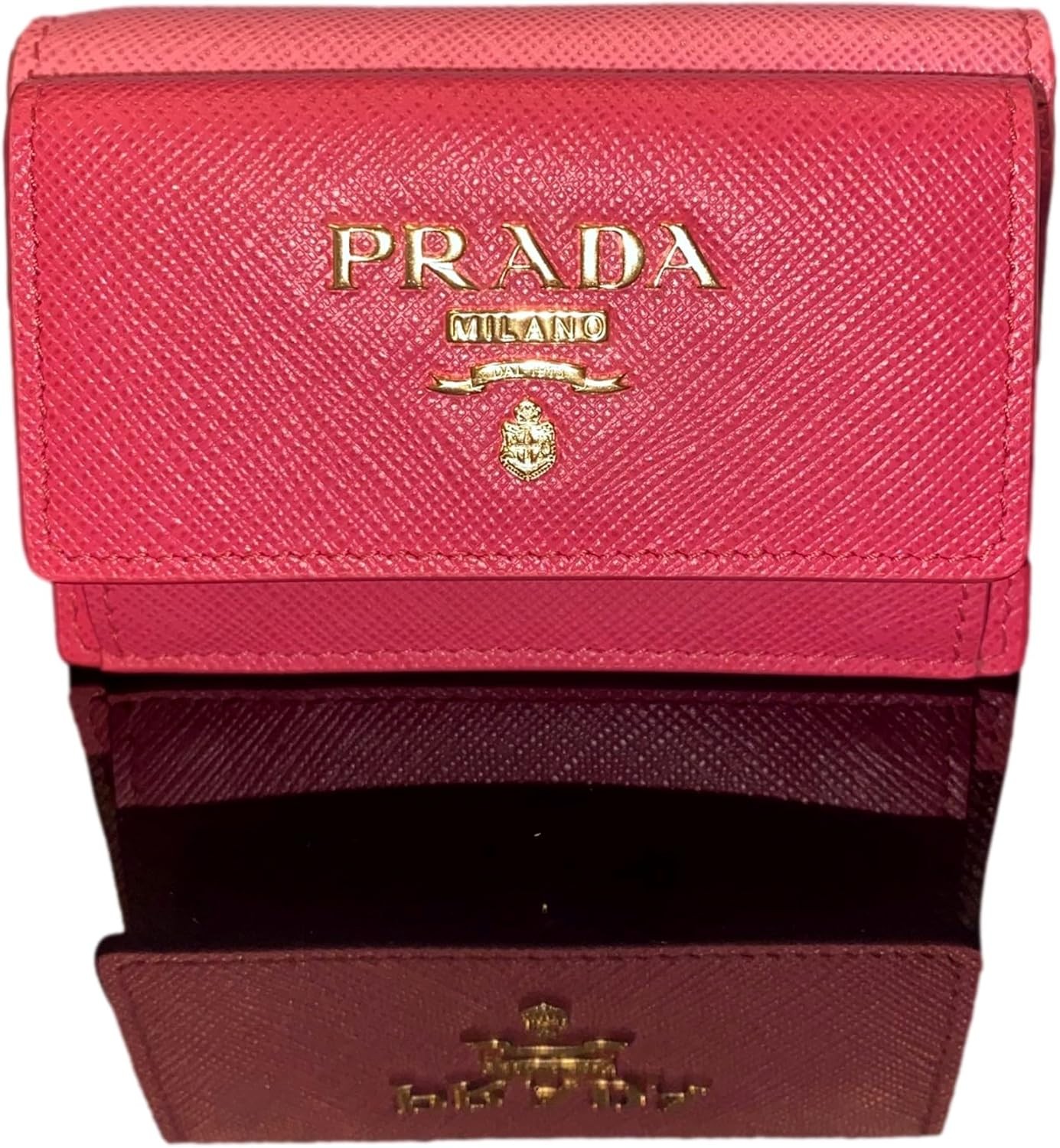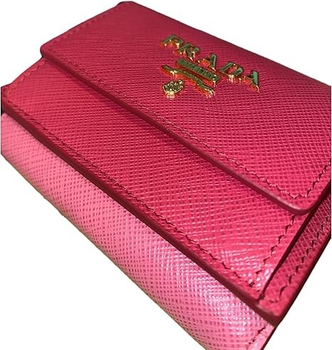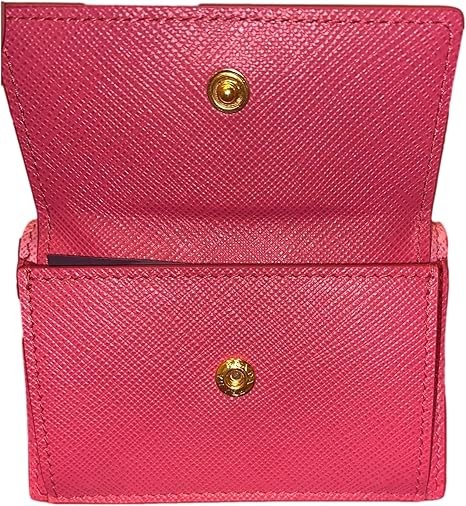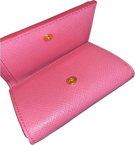 This classic Prada womens trifold envelope wallet is beautiful inside and out. Crafted in pink saffiano leather the attention to detail is in the clean lines and minimal hardware. This trifold leather wallet features an envelope flap opens to a coin pouch with the iconic gold Prada metal emblem on the front.