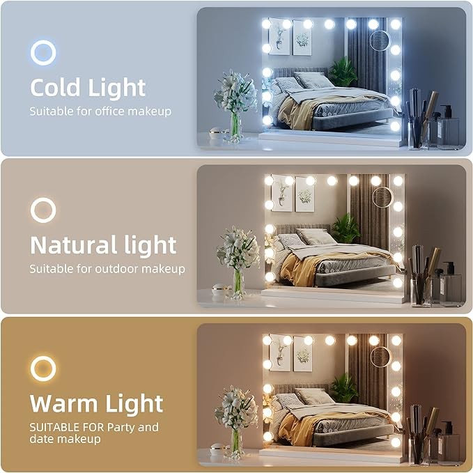 ??Smart vanity mirror with Touch Sensors✨✨: Simply touch turn on/off sensor to light up make up mirror, and change the 3 color modes( warm/natural/cool) by touch “M” sensor, Dimmable brightness from 10-100% by touch “P” accordance with you need while applying makeup. Also the smart makeup mirror with Intelligent light memory function, it will keep the state of your last use
